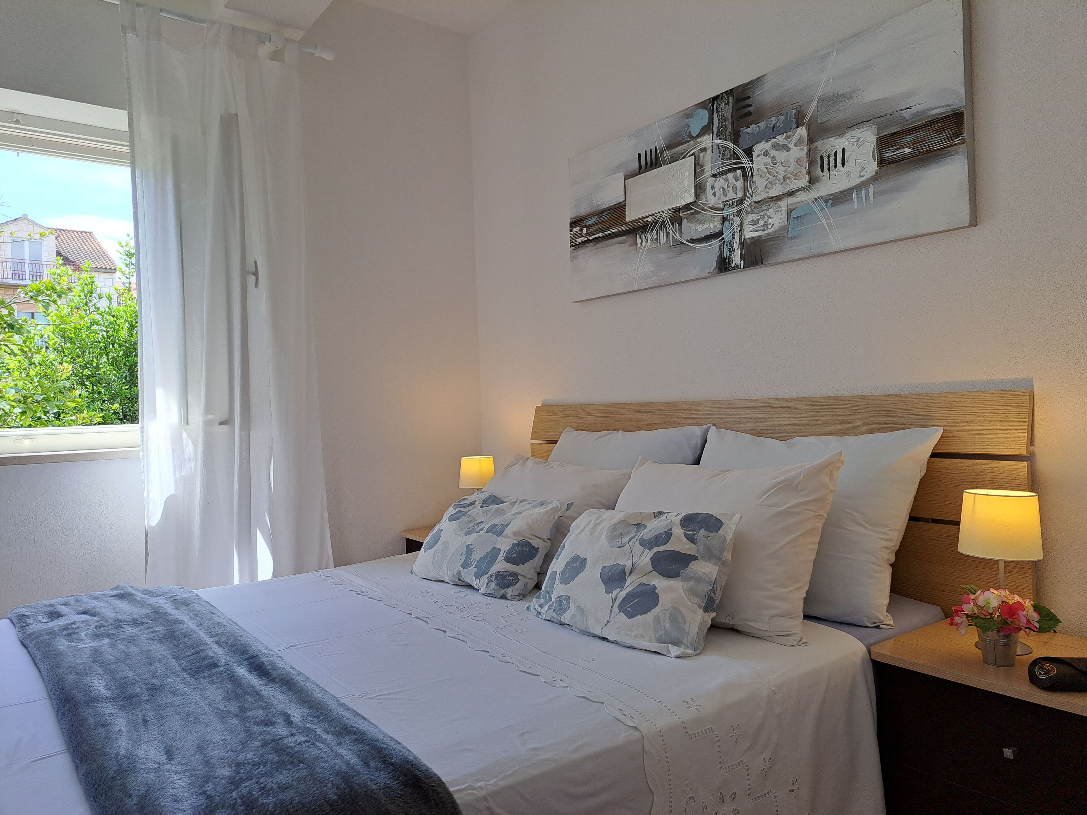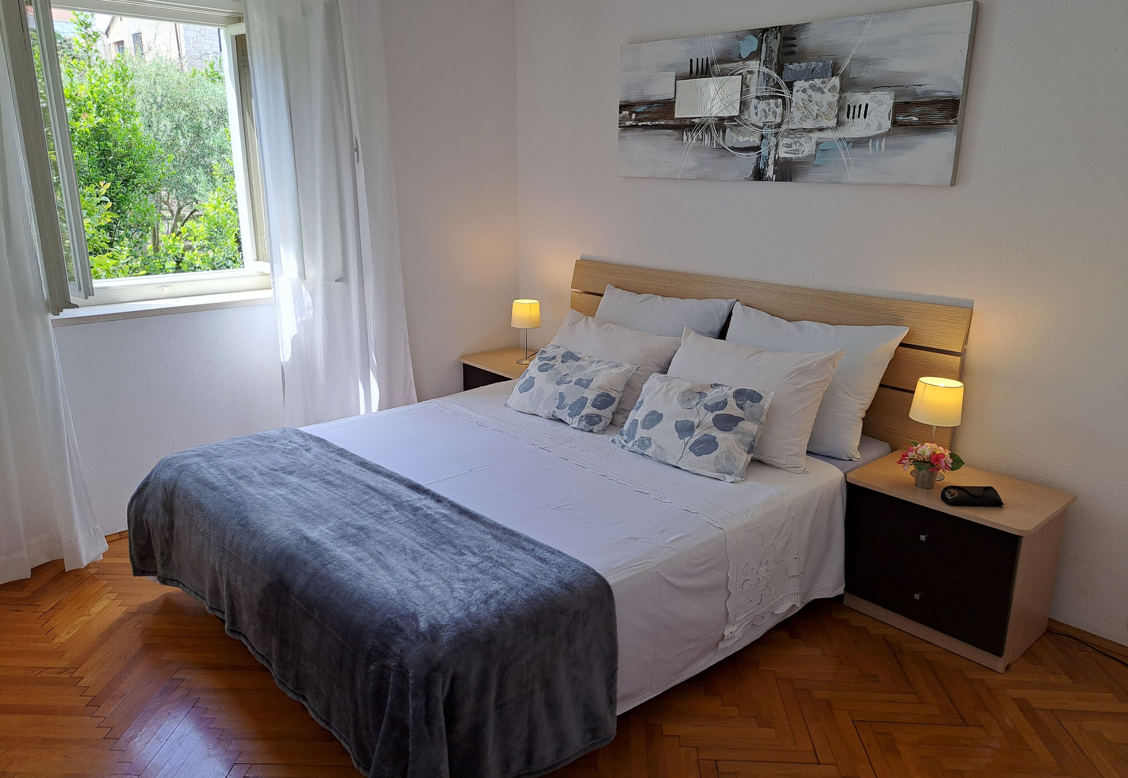 Apartment can accommodate 5 guests. Beds are situated in 2 sleeping rooms, but also in the living room, within 47m2. Food can be prepared using barbecue which is shared with other guests too. Reserved accommodation unit has a shared terrace. INCLUDED IN THE PRICE: tourist tax, final cleaning, air-conditioning, parking, internet, baby cot, iron, ironing board, hairdryer. OBLIGATORY ADDITIONAL COSTS: short stay fee (surcharge depending on a number of booked nights: 30% - 1, 20% - 2, 10% - 3). OPTIONAL ADDITIONAL COSTS: additional bed (€5.00 per night). The availability of additional services for your chosen dates of stay, as well as their prices (if none are listed) must be checked ahead of time. Any additional services not shown in the price calculation are payable directly to the property owner and only if used by the visitor. Discounts to the base price: free day 14=13 (for reservations of 14 or more days you get one free day for the stay until 31122026).