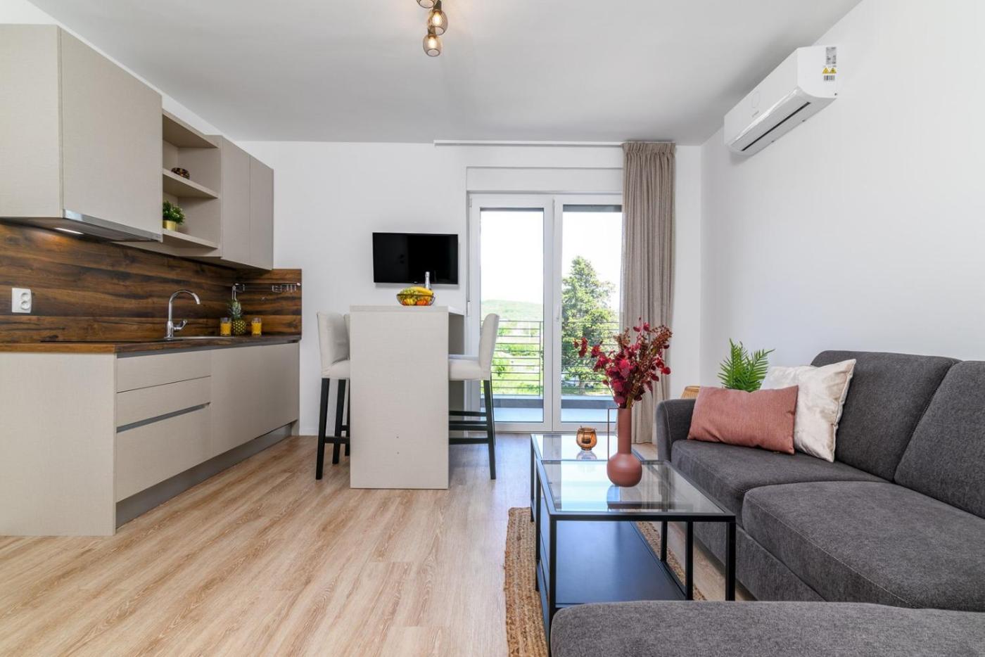 One-Bedroom Apartment. Boasting a private entrance, this air-conditioned apartment comes with 1 living room, 1 separate bedroom and 1 bathroom with a shower and a hairdryer. Guests will find a stovetop, a refrigerator, kitchenware and a microwave in the kitchen. The apartment also includes a barbecue. Featuring a terrace with garden views, this apartment also features a washing machine and a TV with satellite channels. The unit has 2 beds. ;