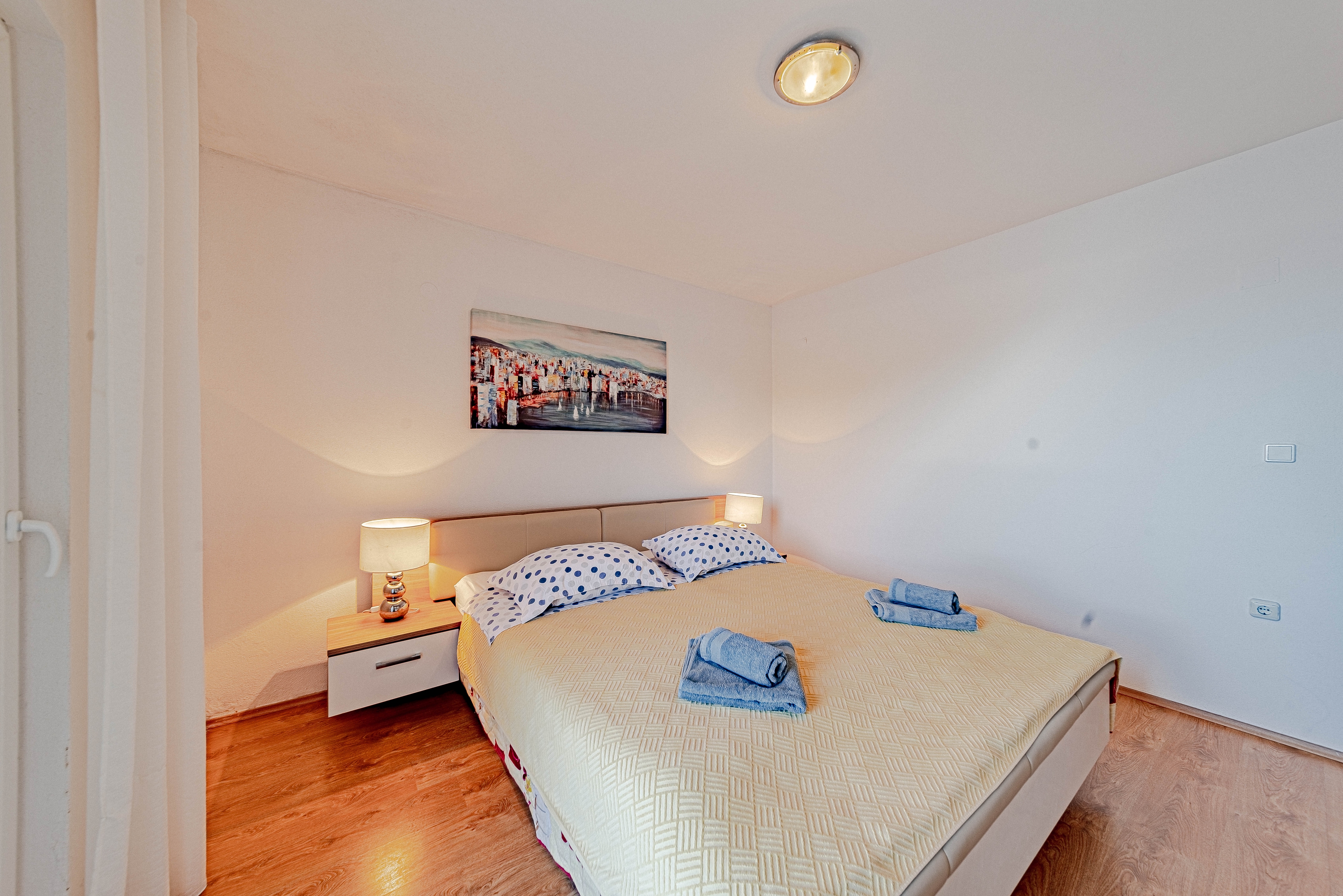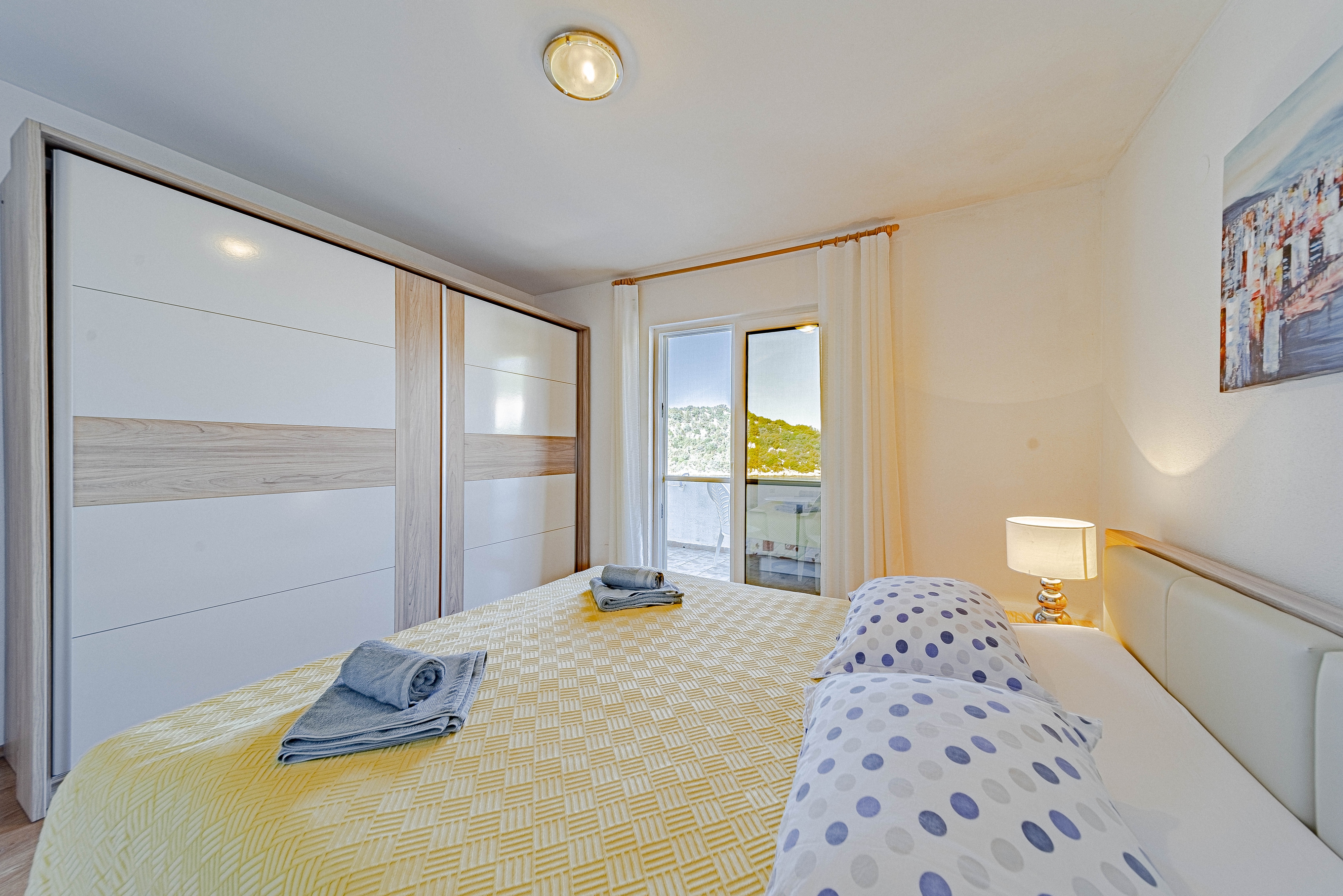 Apartment can accommodate 4 guests. Beds are situated in 1 sleeping rooms, but also in the living room, within 35m2. Guests can use a private terrace to enjoy the warm summer evenings. The apartment offers the sea view. Food can be prepared using barbecue which is shared with other guests too. INCLUDED IN THE PRICE: tourist tax, final cleaning, air-conditioning, parking, internet, baby cot, iron, ironing board, hairdryer, sunshade, sunchairs. OBLIGATORY ADDITIONAL COSTS: short stay fee (surcharge depending on a number of booked nights: 30% - 1, 20% - 2, 10% - 3). OPTIONAL ADDITIONAL COSTS: laundry (€8.00 washing), additional bed (€10.00 per night). The availability of additional services for your chosen dates of stay, as well as their prices (if none are listed) must be checked ahead of time. Any additional services not shown in the price calculation are payable directly to the property owner and only if used by the visitor.
