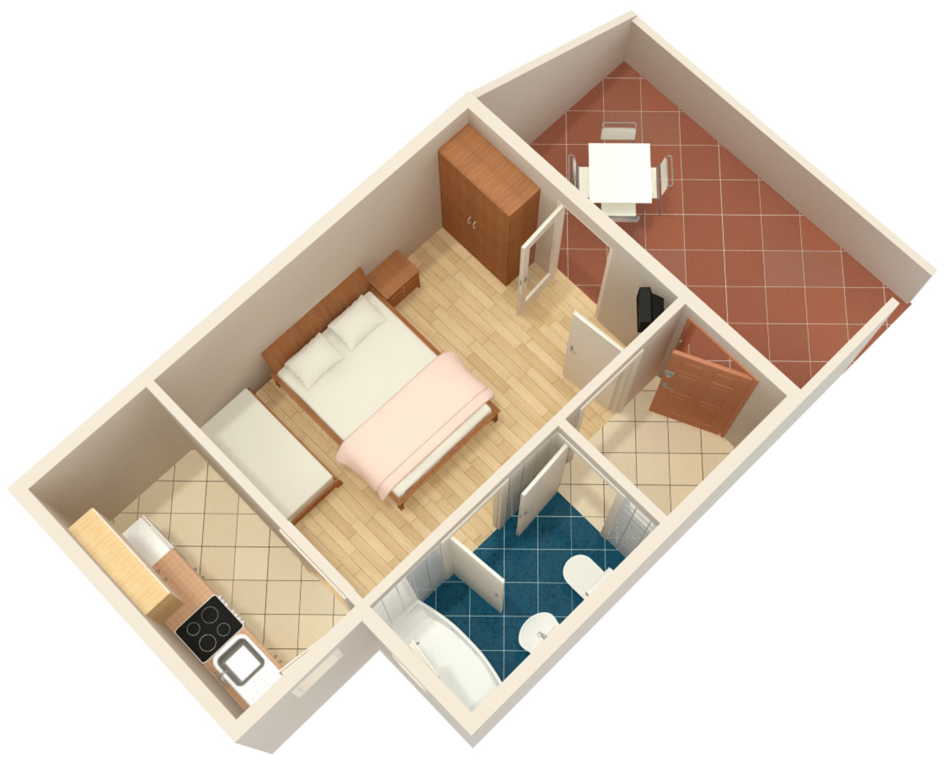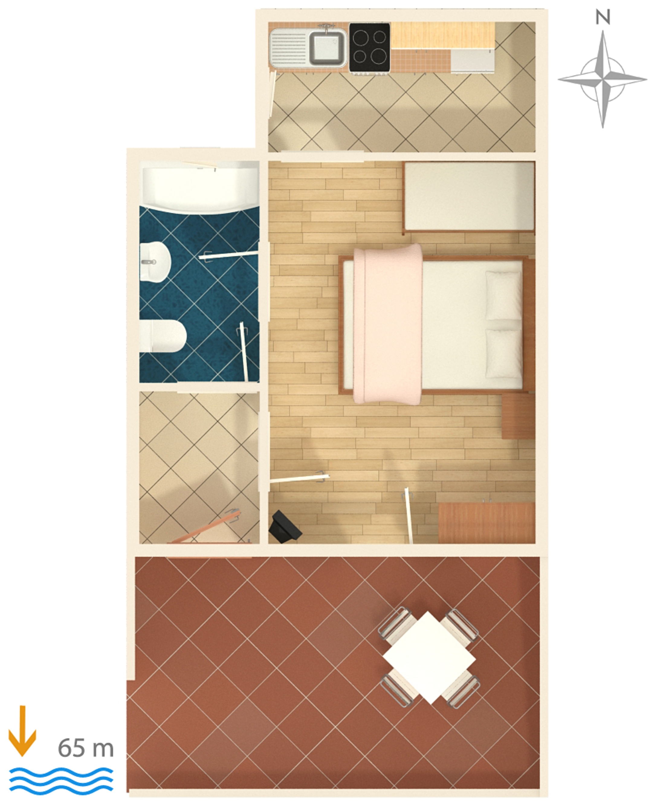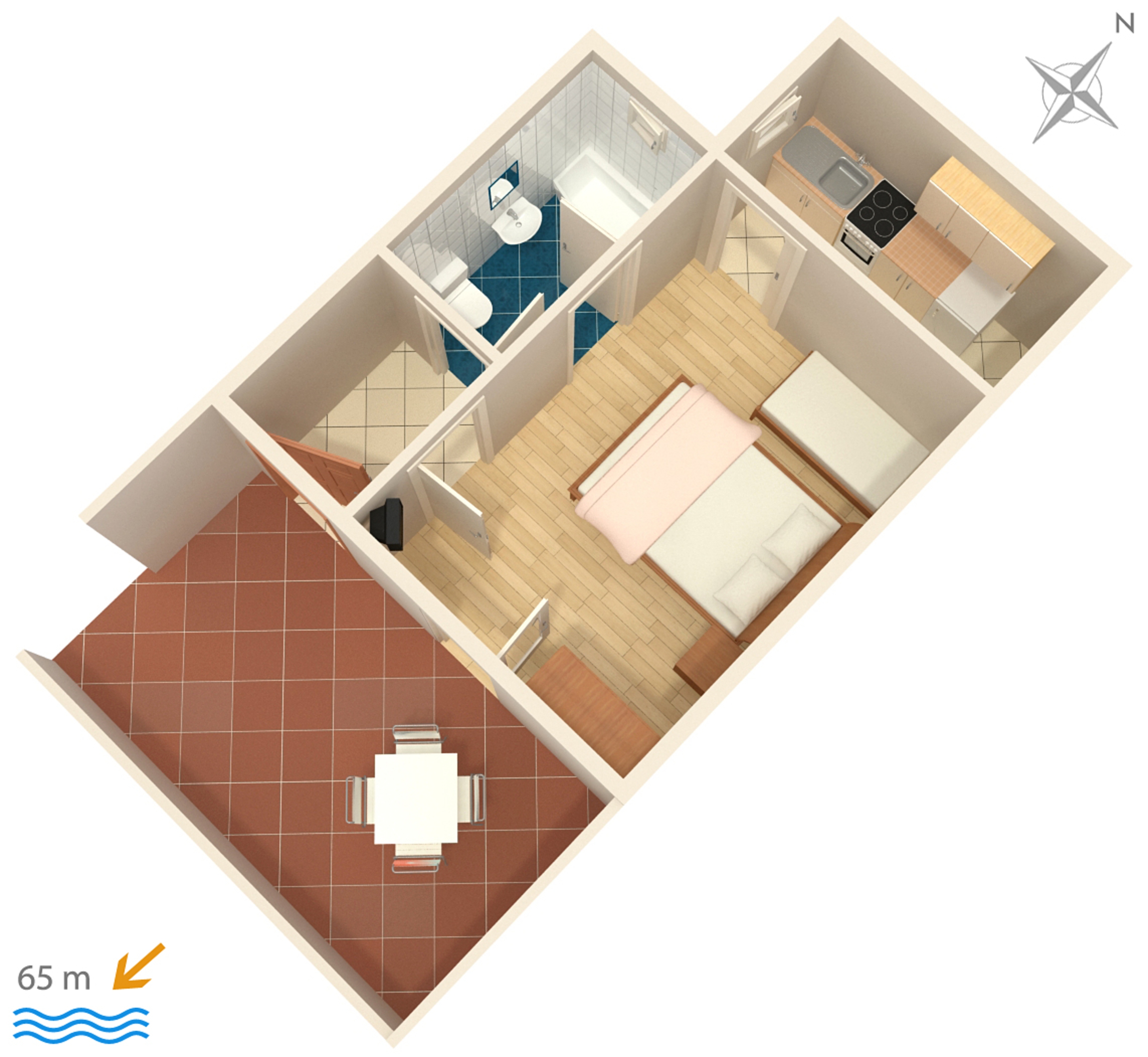 Studio flat can accommodate 3 guests. Beds are situated in 1 sleeping rooms, within 23m2. Guests can use a private terrace to enjoy the warm summer evenings. The studio offers the sea view. INCLUDED IN THE PRICE: tourist tax, final cleaning, air-conditioning, parking, internet, hairdryer. OBLIGATORY ADDITIONAL COSTS: short stay fee (surcharge depending on a number of booked nights: 30% - 1, 20% - 2, 10% - 3). The availability of additional services for your chosen dates of stay, as well as their prices (if none are listed) must be checked ahead of time. Any additional services not shown in the price calculation are payable directly to the property owner and only if used by the visitor.