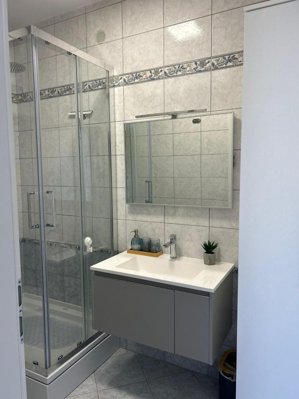 One-Bedroom Apartment. Boasting a private entrance, this air-conditioned apartment features 1 living room, 1 separate bedroom and 1 bathroom with a shower and a hairdryer. Guests will find a stovetop, a refrigerator, a dishwasher and kitchenware in the well-fitted kitchen. The apartment also comes with a barbecue. Featuring a terrace with sea views, this apartment also features a washing machine and a flat-screen TV with cable channels. The unit has 2 beds. ;