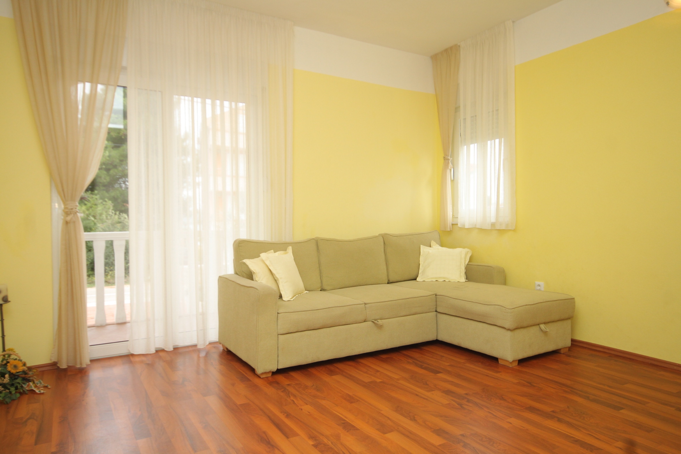 Apartment can accommodate 6 guests. Beds are situated in 2 sleeping rooms, but also in the living room, within 55m2. Guests can use a private terrace to enjoy the warm summer evenings. Food can be prepared using barbecue which is shared with other guests too. INCLUDED IN THE PRICE: tourist tax, final cleaning, air-conditioning, parking, internet, baby cot. OBLIGATORY ADDITIONAL COSTS: short stay fee (surcharge depending on a number of booked nights: 30% - 1, 20% - 2, 10% - 3). The availability of additional services for your chosen dates of stay, as well as their prices (if none are listed) must be checked ahead of time. Any additional services not shown in the price calculation are payable directly to the property owner and only if used by the visitor.