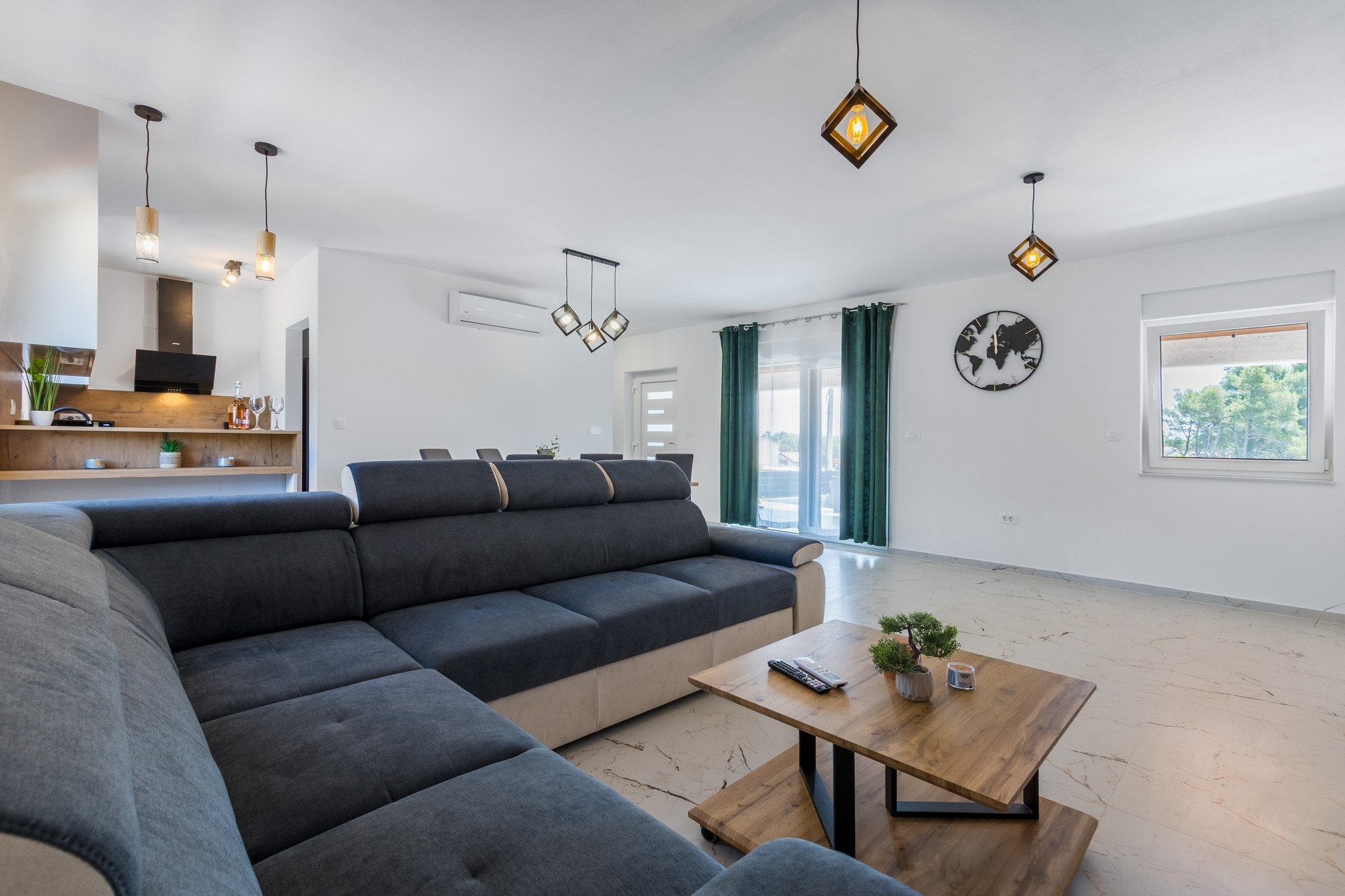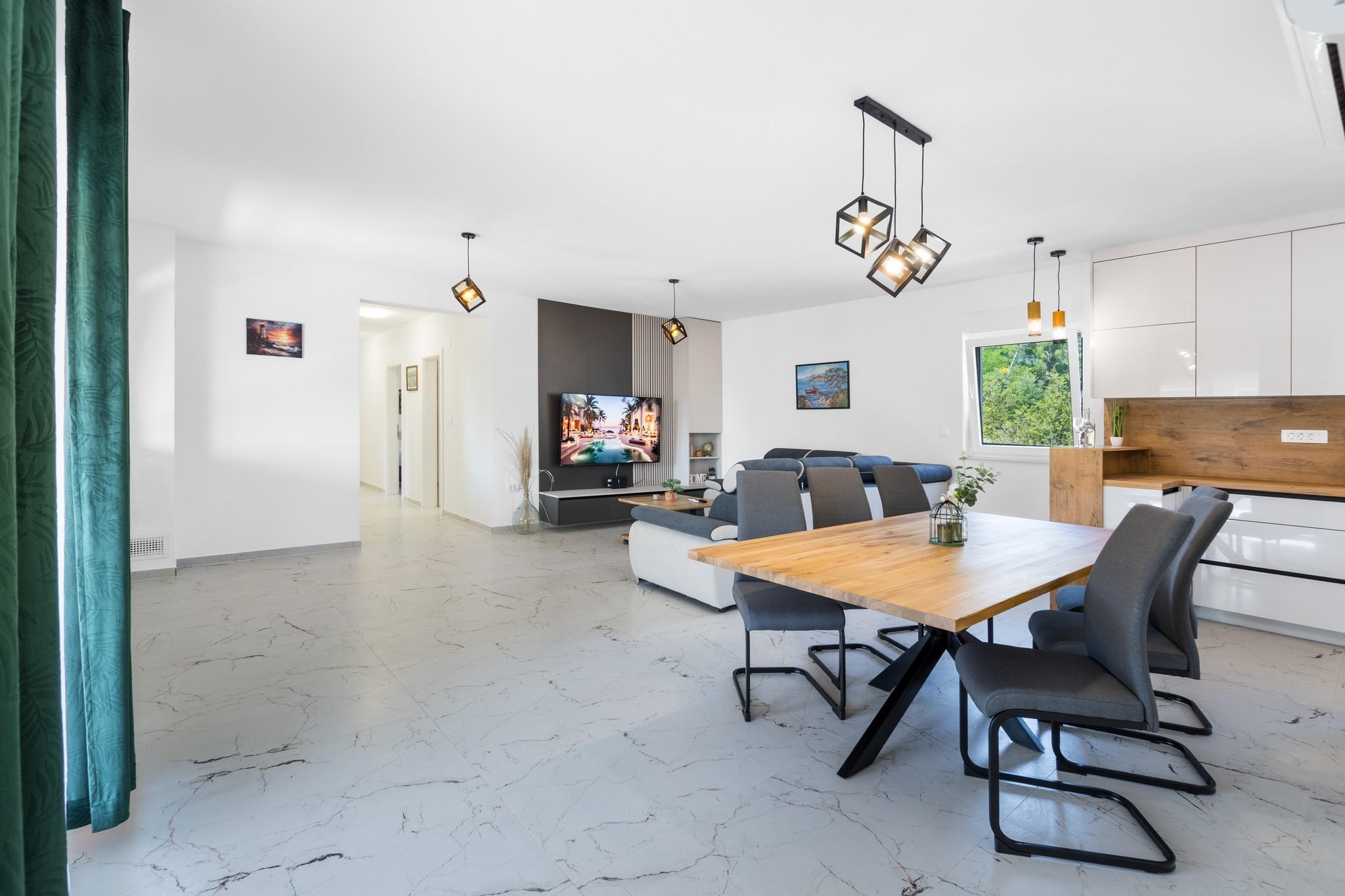 House can accommodate 6 guests. Beds are situated in 3 sleeping rooms, within 125m2. Guests can use a private terrace to enjoy the warm summer evenings. For full enjoyment and relaxation there is a private barbecue for this accommodation guests only. Shared pool is on disposal during stay. INCLUDED IN THE PRICE: tourist tax, final cleaning, air-conditioning, pool, parking, garage, internet, baby cot, iron, ironing board, hairdryer. The availability of additional services for your chosen dates of stay, as well as their prices (if none are listed) must be checked ahead of time. Any additional services not shown in the price calculation are payable directly to the property owner and only if used by the visitor.