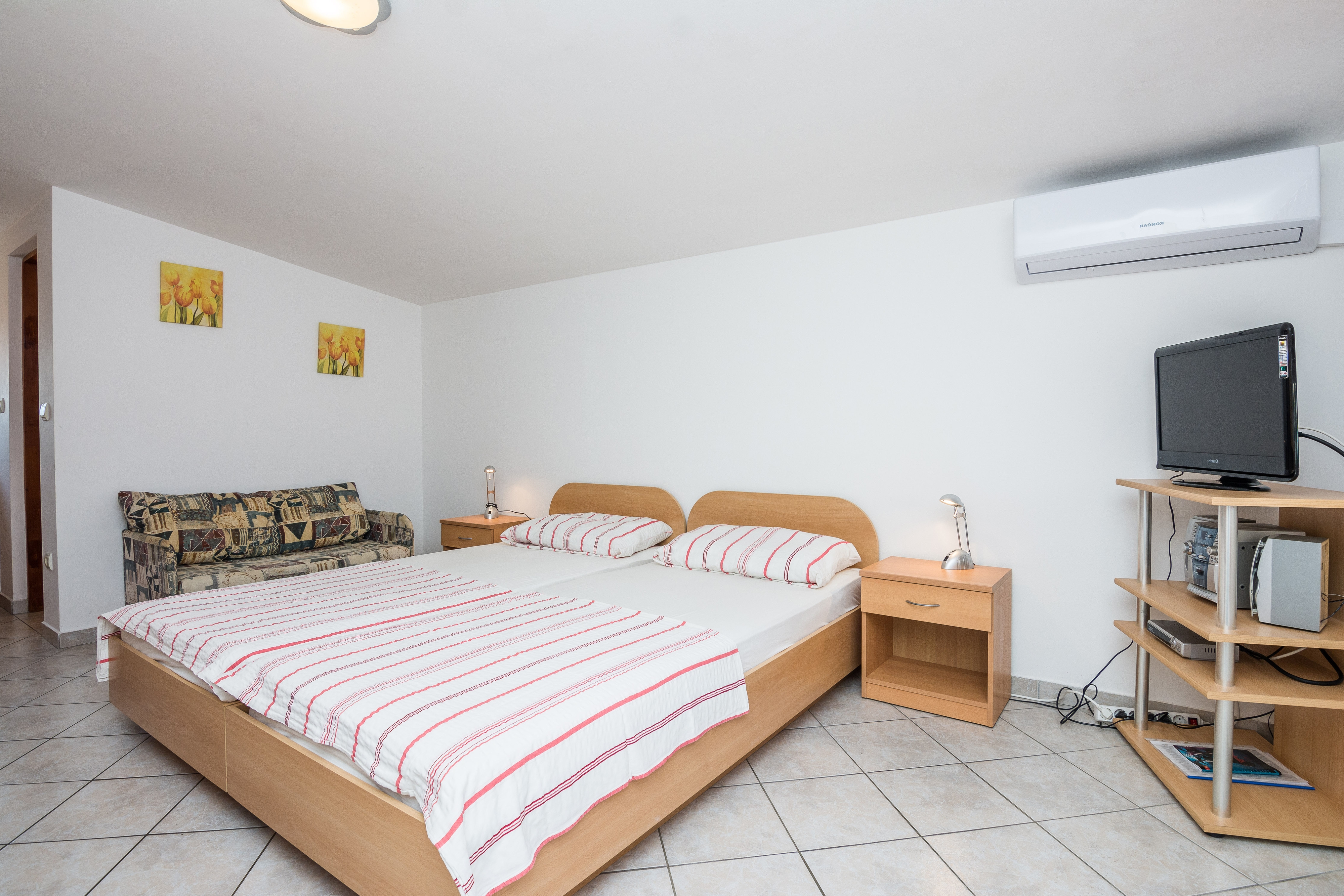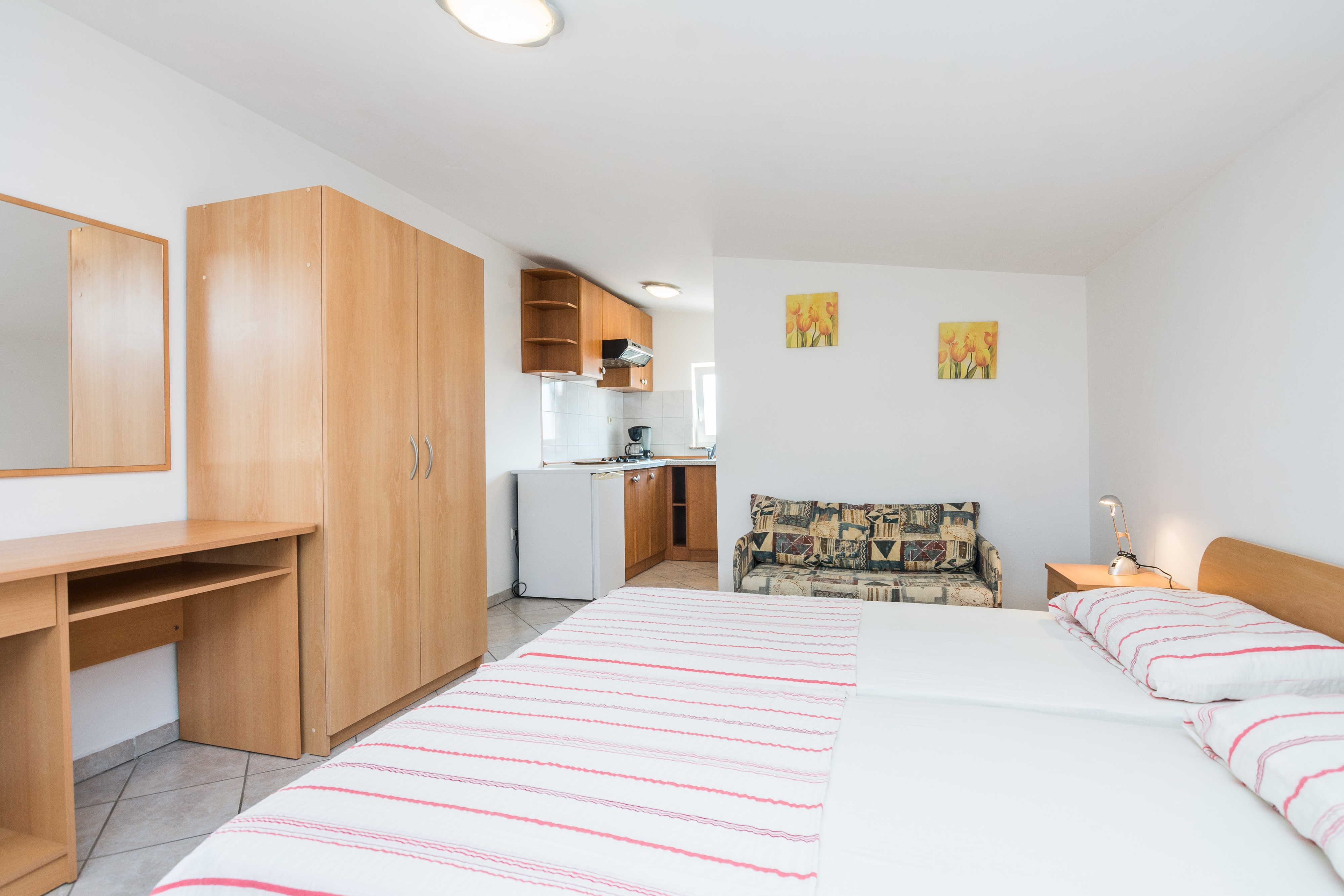 Studio flat can accommodate 2 guests. Beds are situated in 1 sleeping rooms, within 24m2. Guests can use a private balcony to enjoy the warm summer evenings. The studio offers the sea view. Food can be prepared using barbecue which is shared with other guests too. INCLUDED IN THE PRICE: tourist tax, final cleaning, air-conditioning, parking, internet, hairdryer. OBLIGATORY ADDITIONAL COSTS: short stay fee (surcharge depending on a number of booked nights: 30% - 1, 20% - 2, 10% - 3). The availability of additional services for your chosen dates of stay, as well as their prices (if none are listed) must be checked ahead of time. Any additional services not shown in the price calculation are payable directly to the property owner and only if used by the visitor.