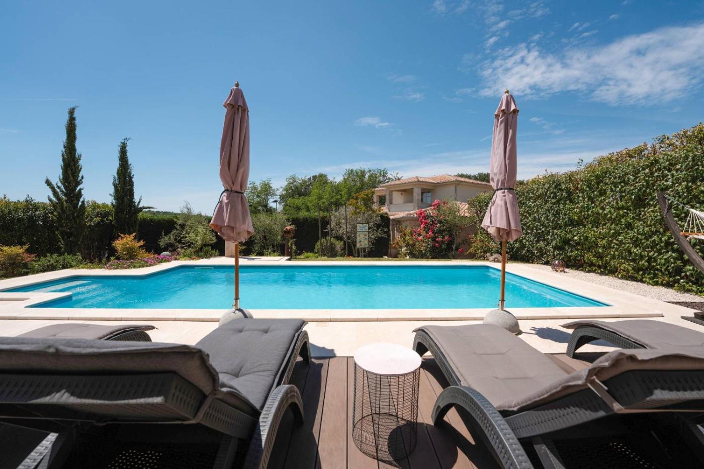 Guests can enjoy the outdoor swimming pool and garden at the villa.