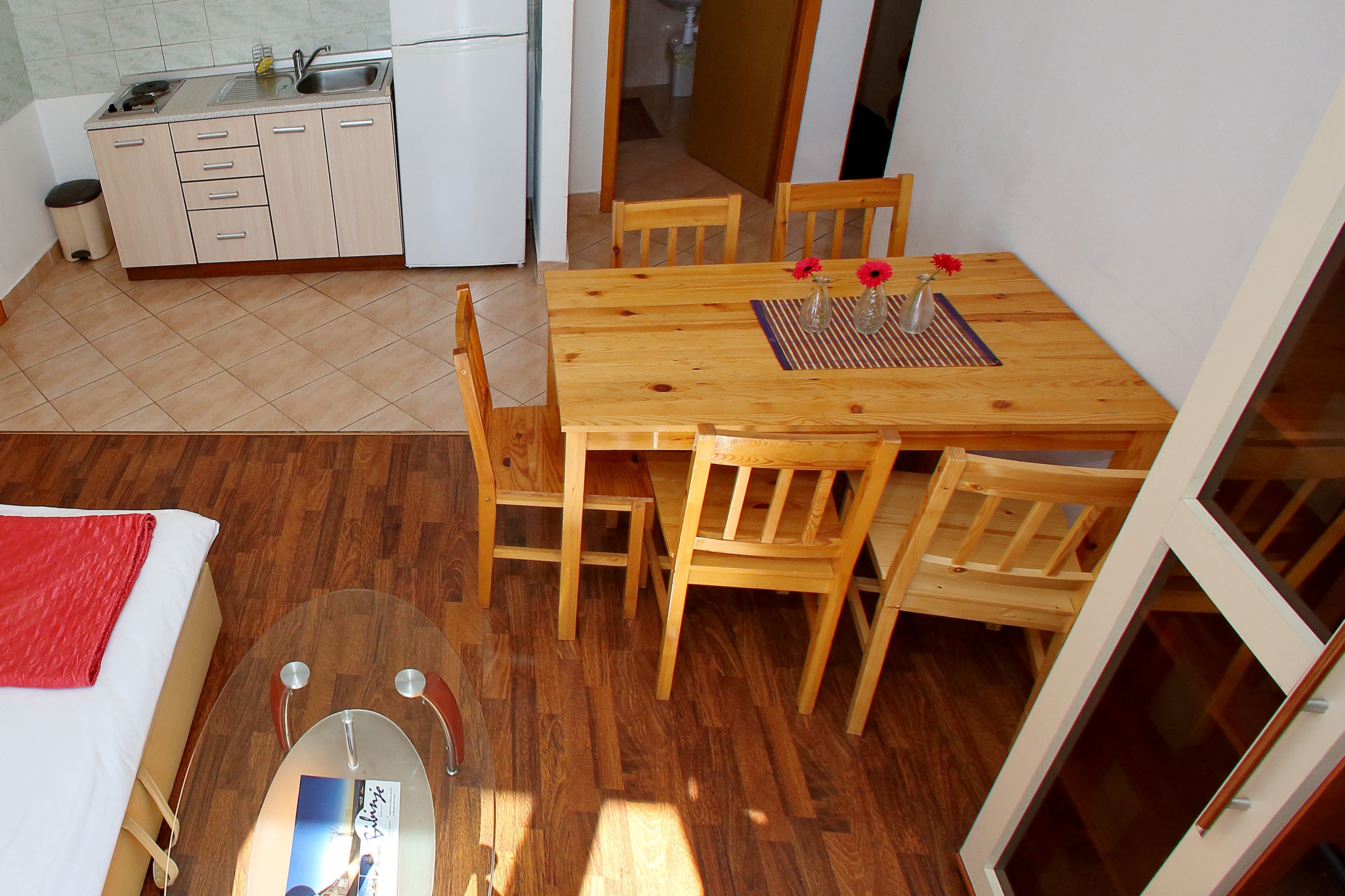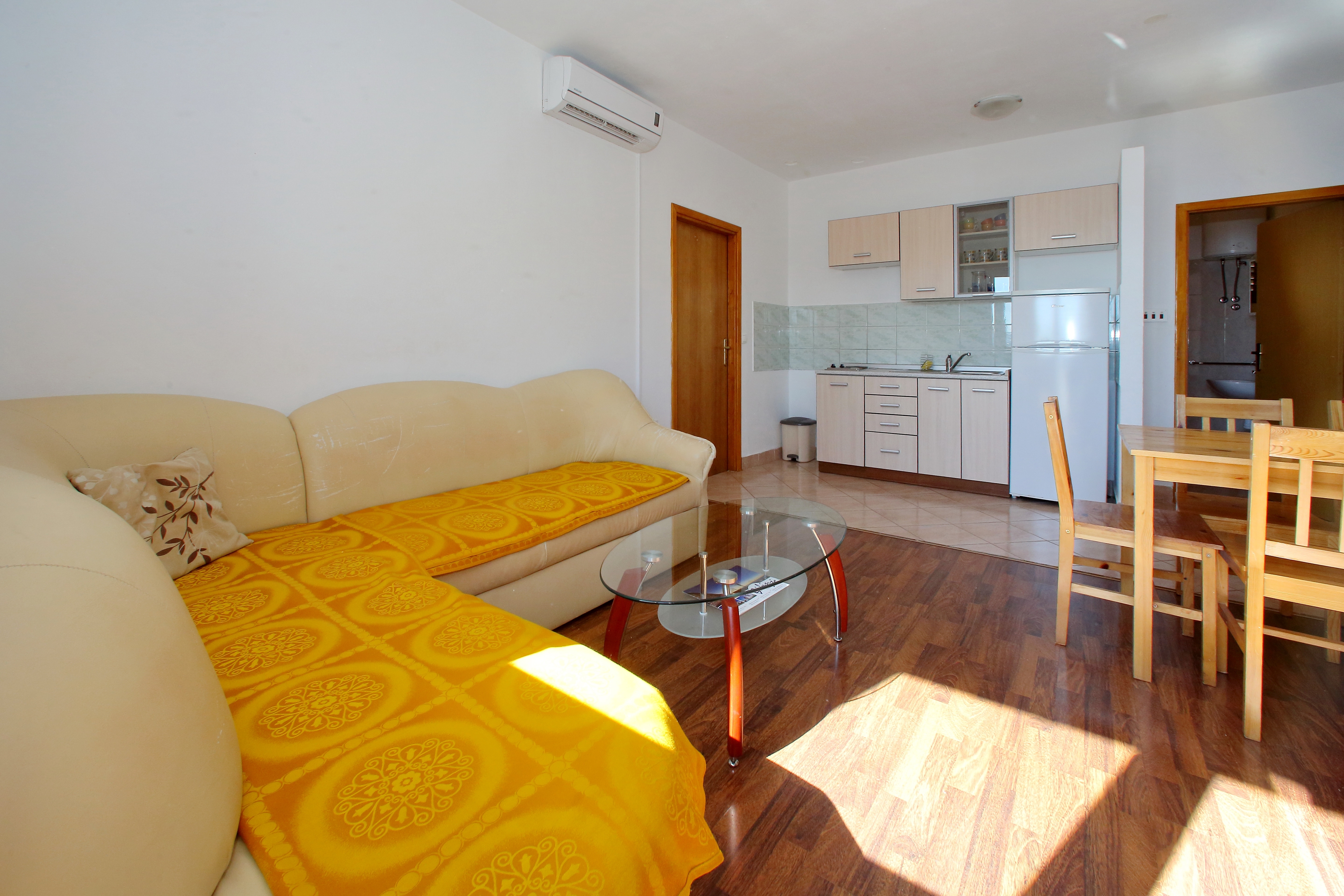 Apartment can accommodate 6 guests. Beds are situated in 2 sleeping rooms, but also in the living room, within 49m2. Guests can use a private balcony to enjoy the warm summer evenings. The apartment offers the sea view. Food can be prepared using barbecue which is shared with other guests too. This accommodation unit welcomes pets at an additional charge. INCLUDED IN THE PRICE: tourist tax, final cleaning, parking, internet, portable barbecue. OBLIGATORY ADDITIONAL COSTS: short stay fee (surcharge depending on a number of booked nights: 30% - 1, 20% - 2, 10% - 3). OPTIONAL ADDITIONAL COSTS: air-conditioning (€5.00 per night), pets (€5.00 per night). The availability of additional services for your chosen dates of stay, as well as their prices (if none are listed) must be checked ahead of time. Any additional services not shown in the price calculation are payable directly to the property owner and only if used by the visitor.